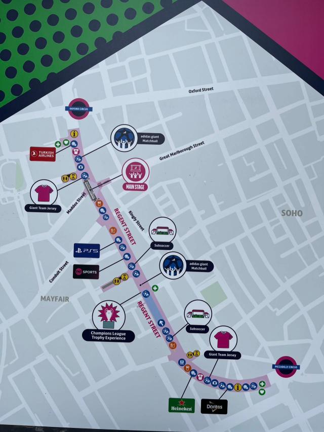 和冷清的温布利相比,当天伦敦的热闹之处其实在市中心的摄政街上。这条伦敦最为宽敞气派的大街当天彻底封路,写有“伦敦 24 决赛”的拱门在摄政街两侧的出入口处竖起,路中央搭建了一座临时舞台,背景屏幕上播放着两队晋级决赛的进球集锦,舞台上定时会有美声合唱,将欧冠主题曲的旋律放送到隔壁的牛津街和皮卡迪利广场,以吸引更多人气。这里沿街除了赞助商的各种体验活动之外,欧足联还在这里露天搭建了数处可供打卡拍照的景点,既有两队的巨型球衣展示,还有模拟新闻发布会的场景,吸引了一众行人围观拍照。不过,这里吸引的主要还是那些原本就要来此购物的游人。你甚至会听到排队拍照的人群里有人迷惑地询问同伴:“这两支球队下个月还会去德国参加欧洲杯么?”